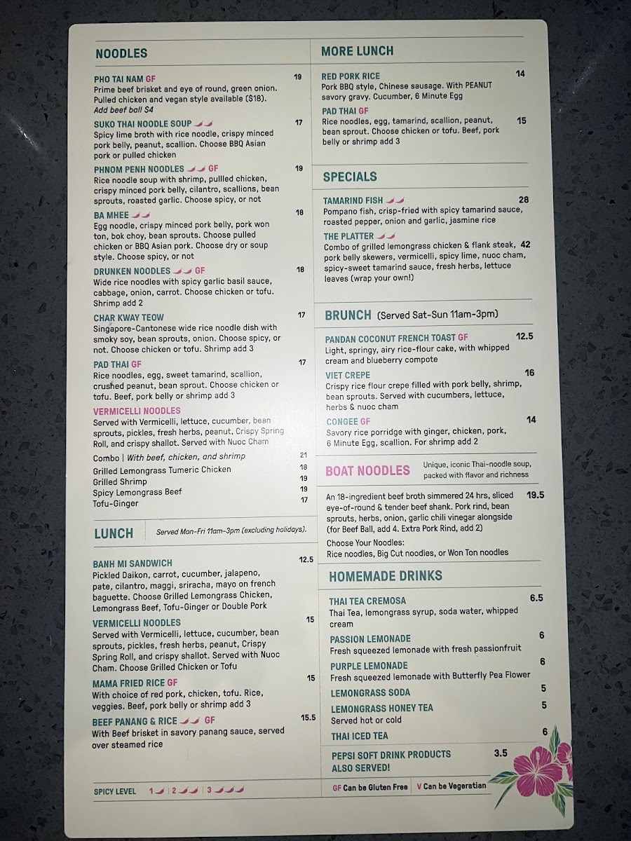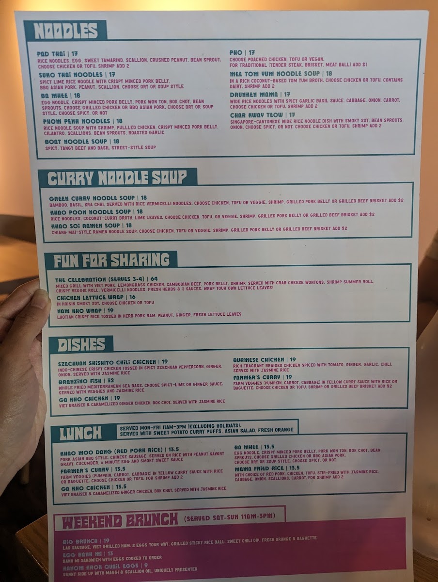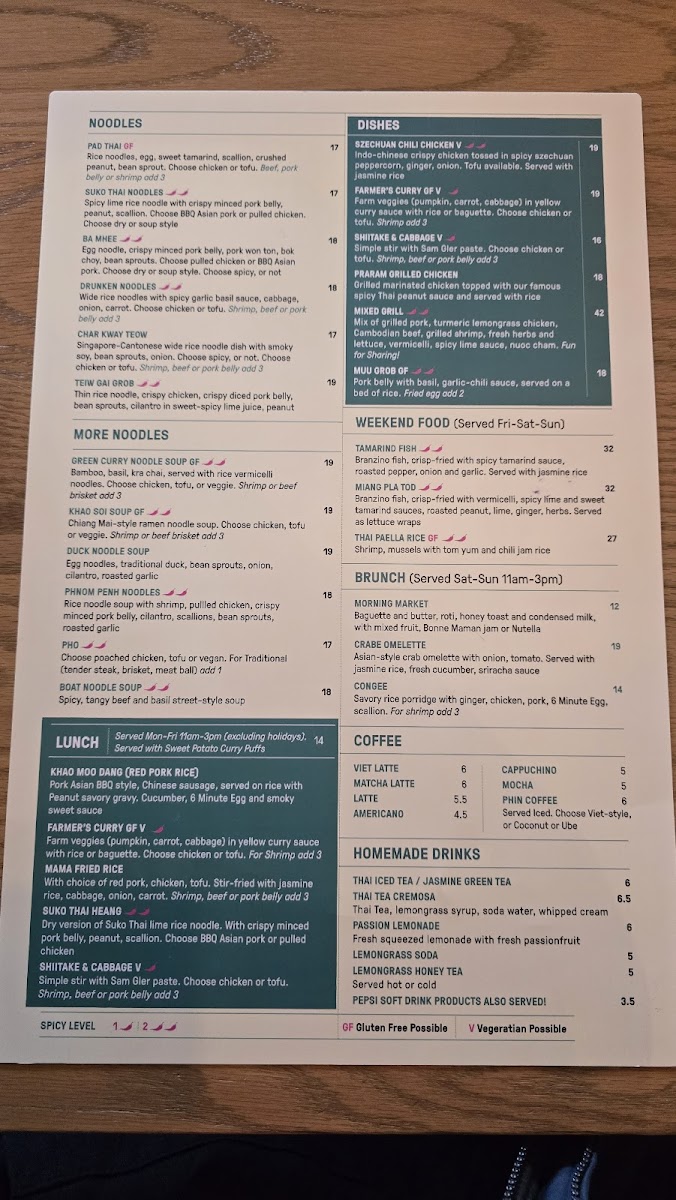 Main courses offer a range of flavors with dishes like Pho Tai Nam, Banh Mi Sandwich with beef, Szechuan Shishito Chili Chicken, Green Curry Noodles with chicken, and Khao Soi Soup. Additional entrées include grilled lemongrass turmeric chicken noodles and curry served with roti, providing heartier meal options for lunch or dinner.